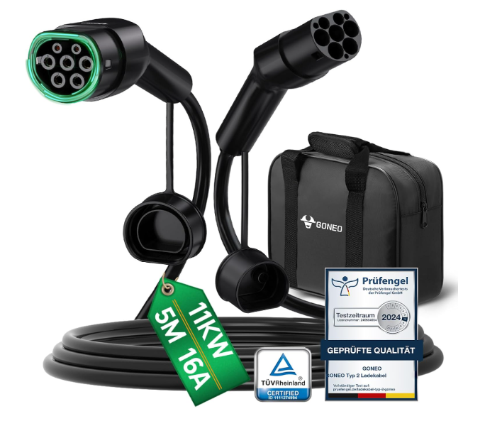 Das GONEO Typ 2 Ladekabel ist ein robustes Mode-3 Ladekabel für Elektro- und Hybridfahrzeuge mit Typ-2-Anschluss. Es unterstützt 11 kW (16 A, 3-phasig) und bietet dank 5 Metern Kabellänge hohe Flexibilität an öffentlichen Ladesäulen und Wallboxen. Ideal geeignet für Fahrzeuge wie Tesla Model S/3/X/Y, VW e-Golf, ID.3, BMW i3/i8 und viele weitere Typ-2-Modelle. Inklusive Transporttasche für saubere und sichere Aufbewahrung.